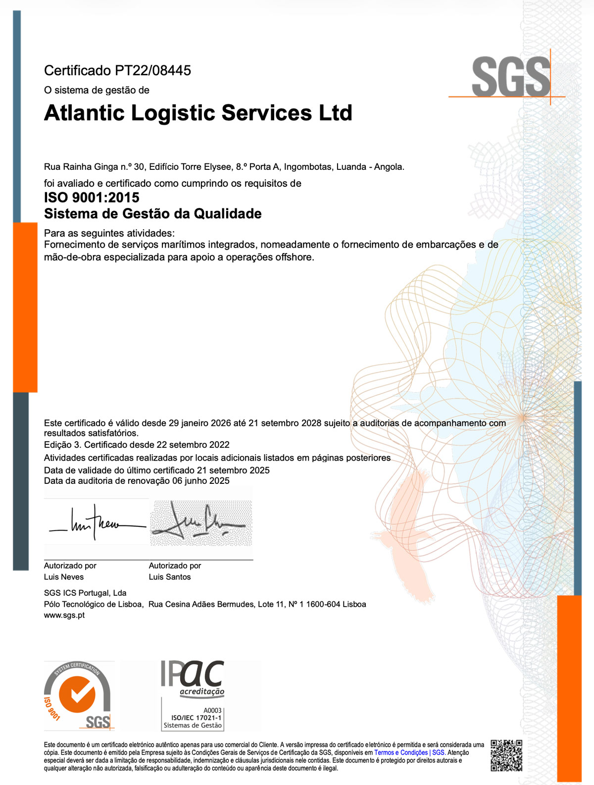 Atlantic Logistic Services, Lda is a 100% Angolan company, fully certified by the National Agency of Petroleum, Gas and Biofuels (ANPG) and by the ISO 9001 standard through SGS and in progress for 14001 and ISO 45001 certifications.